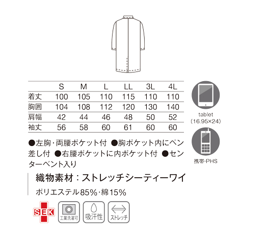 テレビドラマで人気を博したデザインを定番化したこだわりのロング丈白衣。綿混紡ならではの着心地と優れた防シワ性が特長の織物素材を使用しています。
