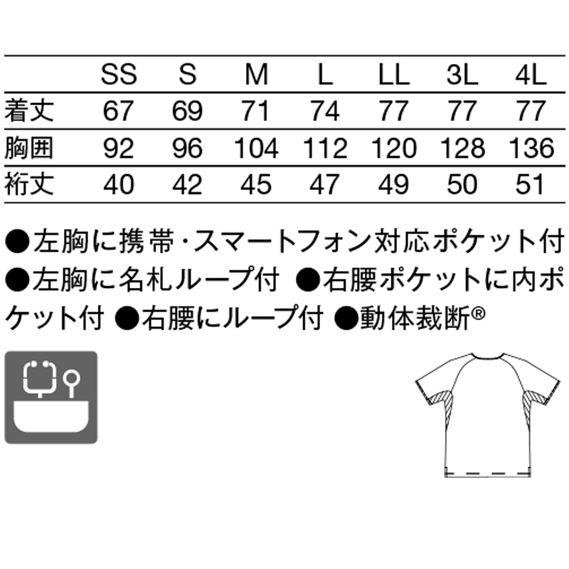 左胸に携帯・スマートフォン対応ポケット付/左胸に名札ループ付/右腰ポケットに内ポケット付/右腰にループ付