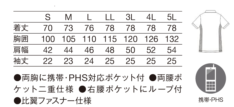 両胸に携帯・PHS対応ポケット付/両腰ポケット二重仕様/右腰ポケットにループ付/比翼ファスナー仕様