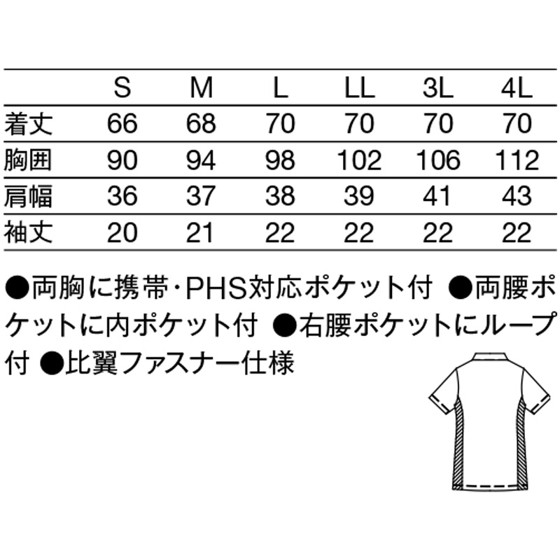 両胸に携帯・PHS対応ポケット付/両腰ポケット二重仕様/右腰ポケットにループ付/比翼ファスナー仕様