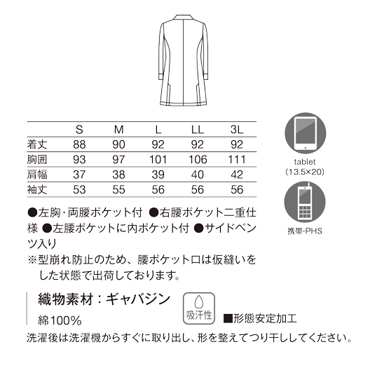 左胸・両腰ポケット付/右腰ポケット二重仕様/左腰ポケットに内ポケット付/両胸に内ポケット付/サイドベンツ入り