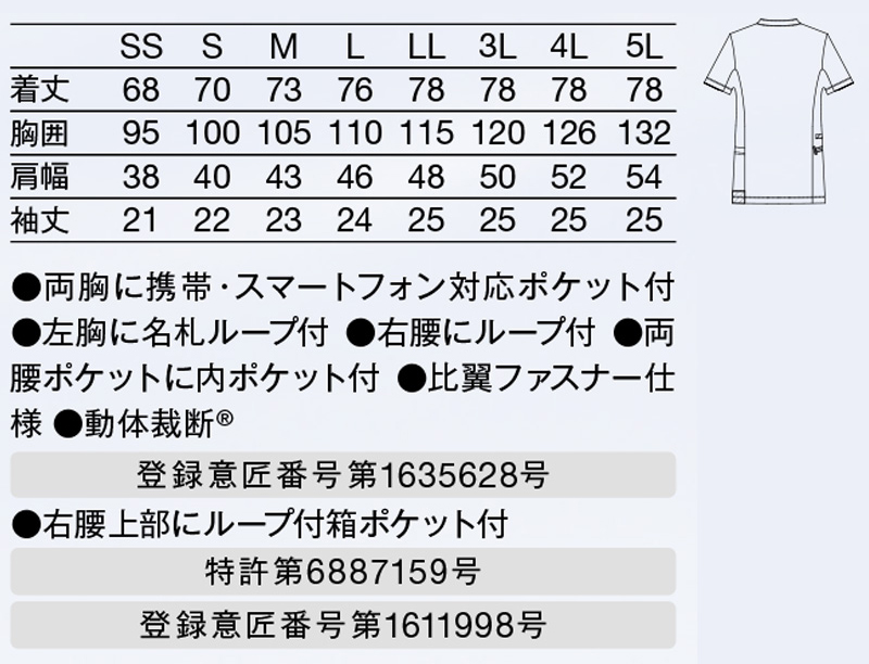 両胸に携帯・スマートフォン対応ポケット付/左胸に名札ループ付/右腰にループ付/両腰ポケットに内ポケット付/比翼ファスナー仕様/右腰上部にループ付箱ポケット付