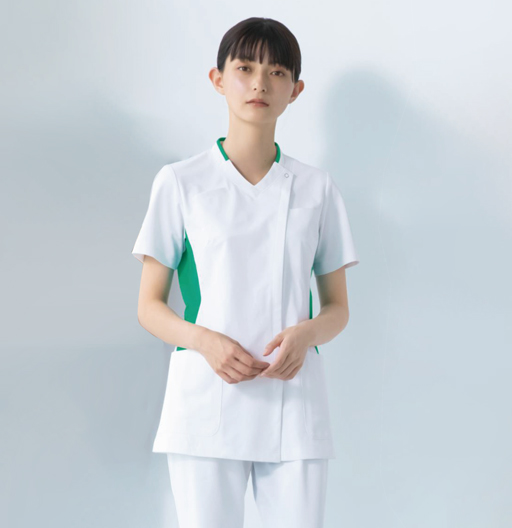 首まわりと脇には洗練された輝く白に映える鮮やかなカラーが魅力のスタイリッシュな配色デザイン。ダイヤモンドを思わせる脇配色の形はウエスト部分がスッキリ見えるようこだわりました。