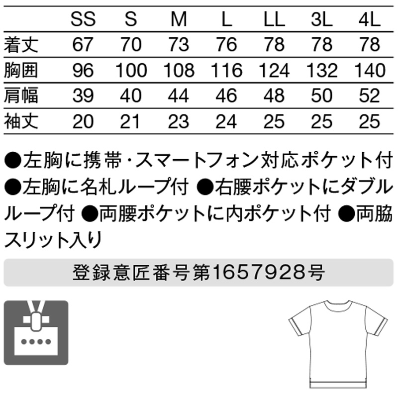 左胸に携帯・スマートフォン対応ポケット付/左胸に名札ループ付/右腰ポケットにダブルループ付/両腰ポケットに内ポケット付/両脇スリット入り