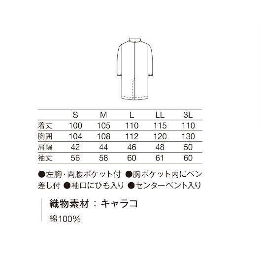 左胸・両腰ポケット付 /胸ポケット内にペン差し付/袖口にひも入り /センターベント入り