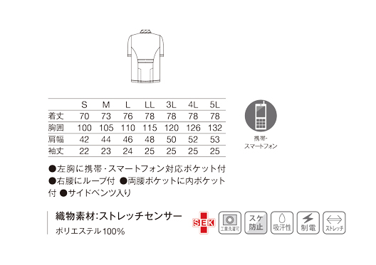 760メンズジャケット半袖 (グレー×ホワイト/S) メンズ 商品コード 760-46 S 価格 6,776円 (税込) 関連タグ #工業洗濯可 #制菌加工 #ストレッチ 信頼感を与えるシックなシャツスタイル。 【織物素材】ストレッチセンサー(ポリエステル100%) 【仕様】左胸に携帯・スマートフォン対応ポケット付/右腰にループ付/両腰ポケットに内ポケット付/サイドベンツ入り サイズ SMLLL3L4L5L グレー×ホワイト サックス×ホワイト ネイビー×サックス お気に入り登録 購入点数 1 カートに入れる 右腰にループ付き。 底がなく、細いポケット内にほこりが溜まらない衛生的なスルーポケットを両腰の内ポケットに。 動きやすいサイドベンツ入り。 773(レディスジャケット半袖)とペアデザインです。 使用している「ストレッチセンサー」はポリエステル100%の織物素材。シワになりにくく軽量。紫外線・可視光線遮蔽セラミックスを練り込んだ十字断面繊維と防透性能をもったストレッチ糸を織り上げた高機能ストレッチ素材です。 購入点数 1 カートに入れる 商品リストに戻る