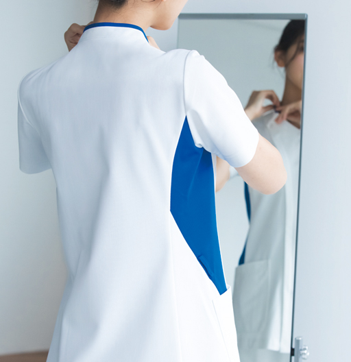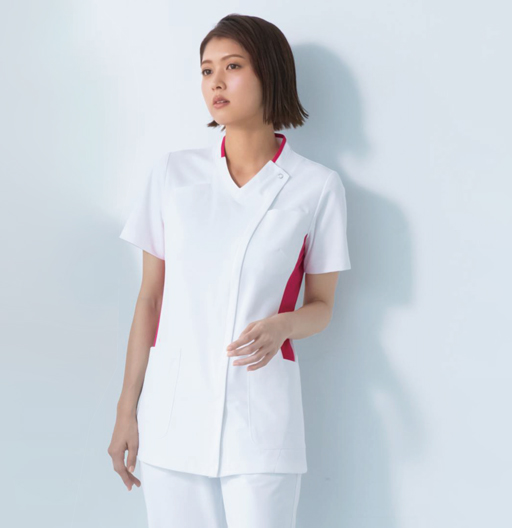 首まわりと脇には洗練された輝く白に映える鮮やかなカラーが魅力のスタイリッシュな配色デザイン。ダイヤモンドを思わせる脇配色の形はウエスト部分がスッキリ見えるようこだわりました。