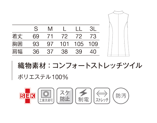 左胸にポケット付/左胸に名札ループ付/両腰にポケット付