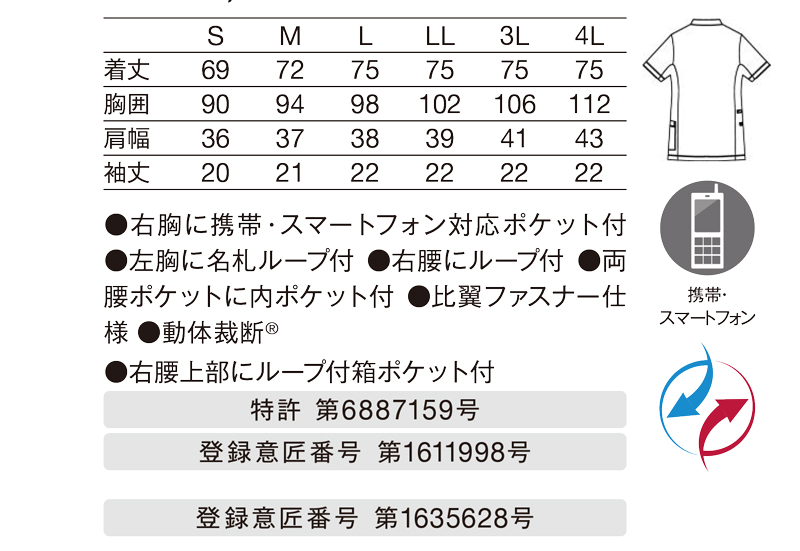 左胸に携帯・スマートフォン対応ポケット付/左胸に名札ループ付/右腰ポケットにダブルループ付/両腰ポケットに内ポケット付/比翼ファスナー仕様/右腰上部にループ付箱ポケット付