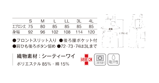 動きやすさに配慮し、フロントに長いスリットを入れたミドル丈。使用している「シーティーワイ」はシワになりにくく、形態安定性に優れたイージーケア素材です。綿混紡ならではの肌触りと風合い、発色の良さが特長です。静菌加工