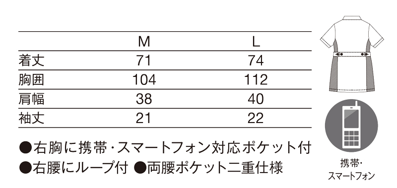 右胸に携帯・スマートフォン対応ポケット付/右腰にループ付/両腰ポケット二重仕様