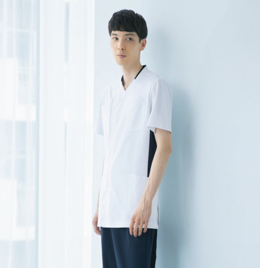 首まわりと脇には洗練された輝く白に映える鮮やかなカラーが魅力のスタイリッシュな配色デザイン。ダイヤモンドを思わせる脇配色の形はウエスト部分がスッキリ見えるようこだわりました。