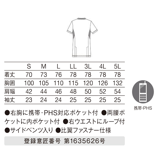 左胸に携帯・PHS対応ポケット付/両腰ポケットに内ポケット付/右ウエストにループ付/サイドベンツ付/比翼ファスナー仕様(登録意匠番号 第1635626 号)