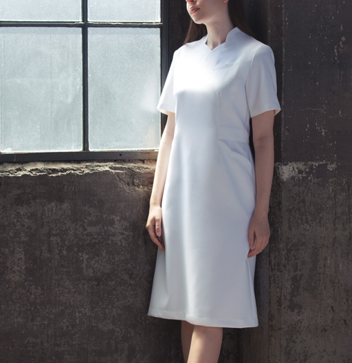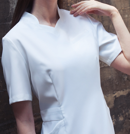 衿元は、柔らかな曲線のデザイン。左胸にポケット付。