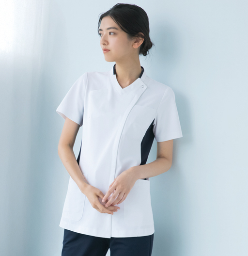 首まわりと脇には洗練された輝く白に映える鮮やかなカラーが魅力のスタイリッシュな配色デザイン。ダイヤモンドを思わせる脇配色の形はウエスト部分がスッキリ見えるようこだわりました。