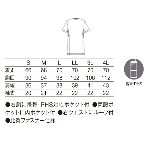 右胸に携帯・PHS対応ポケット付/両腰ポケットに内ポケット付/右ウエストにループ付/比翼ファスナー仕様