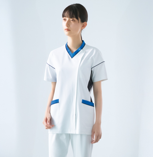 働く人のそれぞれに向き合うデザインを。白に映える脇部分と衿・ポケット口の配色が異なるデザインは、見る角度で違った表情を見せてくれます。2色の異なる配色を使うことで配色に合わせたボトムカラーが選択可能に。部署だけでなく日勤と夜勤の区別など上下セットでのアプローチが可能です。