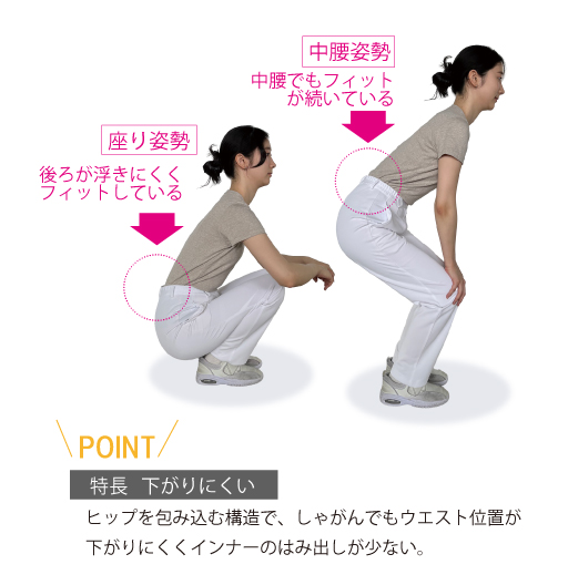 ウエストベルト通し付、脇ゴム仕様。 -