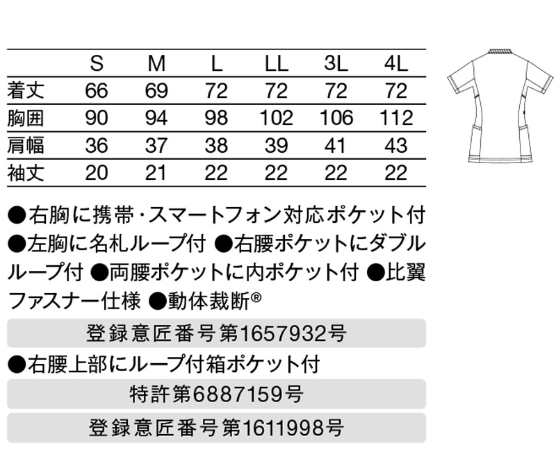 左胸に携帯・スマートフォン対応ポケット付/左胸に名札ループ付/右腰ポケットにダブルループ付/両腰ポケットに内ポケット付/比翼ファスナー仕様/右腰上部にループ付箱ポケット付