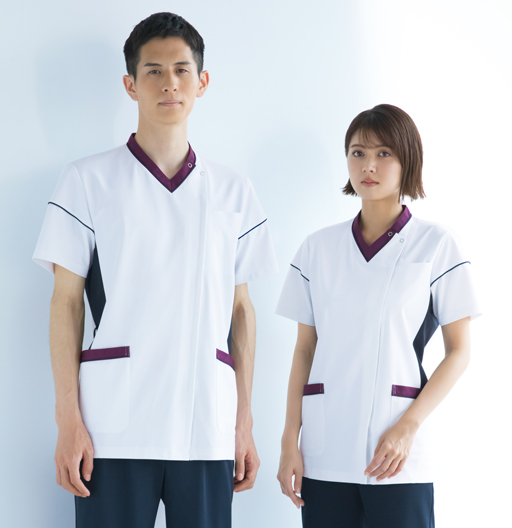 働く人のそれぞれに向き合うデザインを。白に映える脇部分と衿・ポケット口の配色が異なるデザインは、見る角度で違った表情を見せてくれます。2色の異なる配色を使うことで配色に合わせたボトムカラーが選択可能に。部署だけでなく日勤と夜勤の区別など上下セットでのアプローチが可能です。