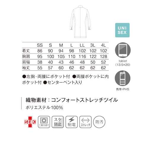 KZN115ユーティリティコート(男女兼用) (ターコイズ/SS) 商品コード KZN115-42 SS 価格 10,208円 (税込) 関連タグ #男女兼用 #制菌加工 #ストレッチ 「自信と決意、堂々と纏う。」ドクターはもちろんのこと、検査機関やドラッグストア等、幅広いシーンで着用いただける4色のユーティリティコート。ストレッチ性に優れた素材に加え、ユニセックスでも美しく着られるよう、シルエットにもこだわりました。 【織物素材】 コンフォートストレッチツイル(ポリエステル100%) 【仕様】 左胸・両腰にポケット付/両腰ポケットに内ポケット付/センターベント入り サイズ SSSMLLL3L4L カーキ ターコイズ ネイビー ライトグレー お気に入り登録 購入点数 123456789101112131415161718192021222324252627282930 カートに入れる 両腰に備えたタブレット端末も入る大きめのポケットには、左右で大きさが異なる、小物を整理しやすい内ポケット付。 ボタンなしのスリット入り袖口。折り返しやすく、たくし上げても美しく、かつ快適に着こなせます。 足さばきを考慮した、動きやすい長めのセンターベント入り。 購入点数 123456789101112131415161718192021222324252627282930 カートに入れる 商品リストに戻る
