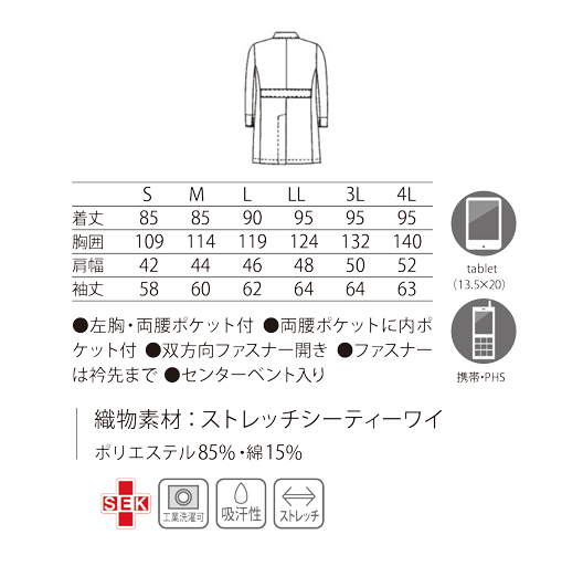 113メンズハーフコート (オフホワイト/S) メンズ 商品コード 113-90 S 価格 8,888円 (税込) 関連タグ #制菌加工 #ストレッチ #吸汗性 衿先までジップアップし、スタンドカラーにしても着用可能な診察衣。上下双方向に開閉できるハーフコートは、羽織るだけでなも様になる、業界初のスタイルです。 【織物素材】 ストレッチシーティーワイ(ポリエステル85%、綿15%) 【仕様】 左胸・両腰ポケット付/両腰ポケットに内ポケット付/双方向ファスナー開き/ファスナーは衿先まで/センターベント入り サイズ SMLLL3L4L オフホワイト お気に入り登録 購入点数 123456789101112131415161718192021222324252627282930 カートに入れる 衿先までジップアップし、スタンドカラーにしても着用いただけます。 折り返したり、たくし上げたりが可能なスリット入りの袖口。 適度なストレッチ性があり、ファスナーを閉めたままでも腕の上下や前後運動に伴う突っ張り感がありません。 購入点数 123456789101112131415161718192021222324252627282930 カートに入れる 商品リストに戻る